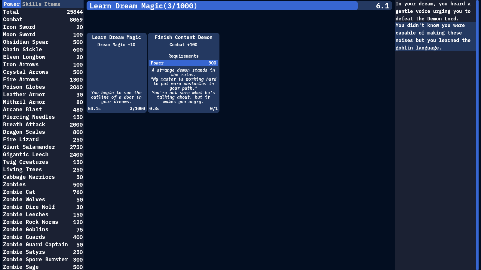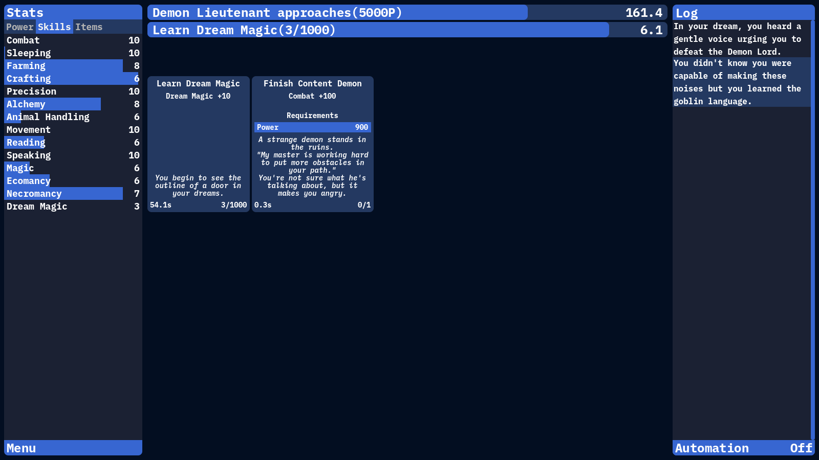 I think there is a bug with the loop button for the "end content demon". It kept saying I needed to click the demon 3 times to unlock the button but it never became available even after I clicked him a bunch. Also the buttons for the swamp sections seemed to be separated all around the mountian and wizard options as opposed to being together. If all of the swamp options were below the wizard options at the very bottom it probably would have been easier to scroll through.
